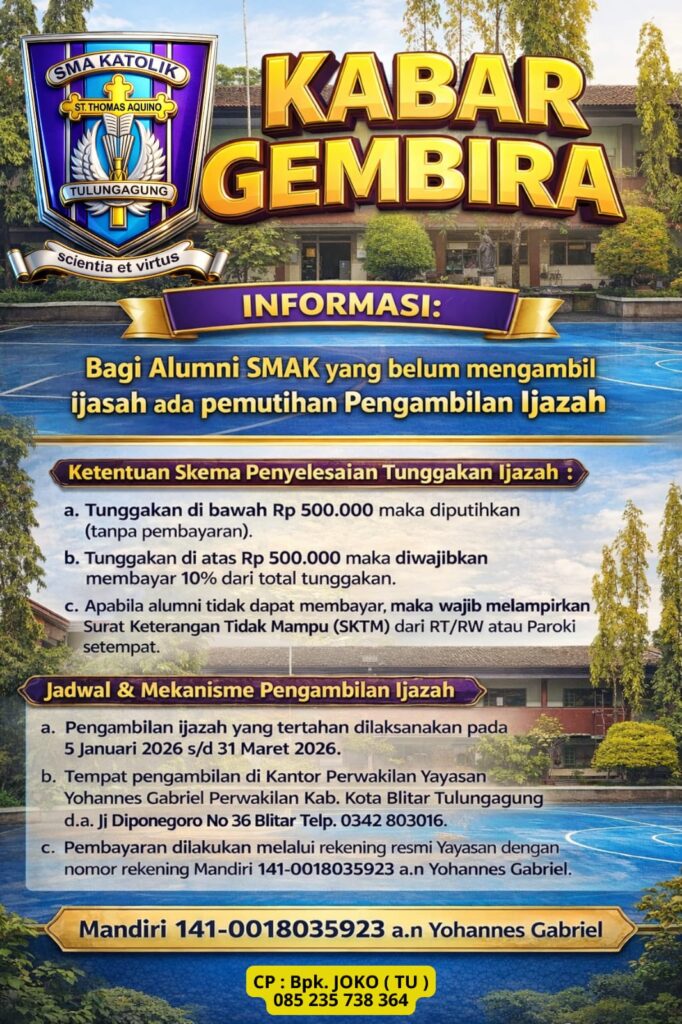 smaksta.sch.id – 12/01/2026, 09:26 Editor : Mathias Theo Ardi Tulungagung, 12 Januari 2026 – Dalam rangka memperingati 100 Tahun Yohannes Gabriel, Yayasan Yohannes Gabriel mengumumkan skema khusus untuk penyelesaian tunggakan ijazah siswa yang masih tertahan di sekolah-sekolah di bawah naungannya. Pengumuman ini menindaklanjuti instruksi dari Bapa Uskup melalui surat nomor 6018/YG/E.II-IV/12-2025 tertanggal 1 Desember 2025. […]
