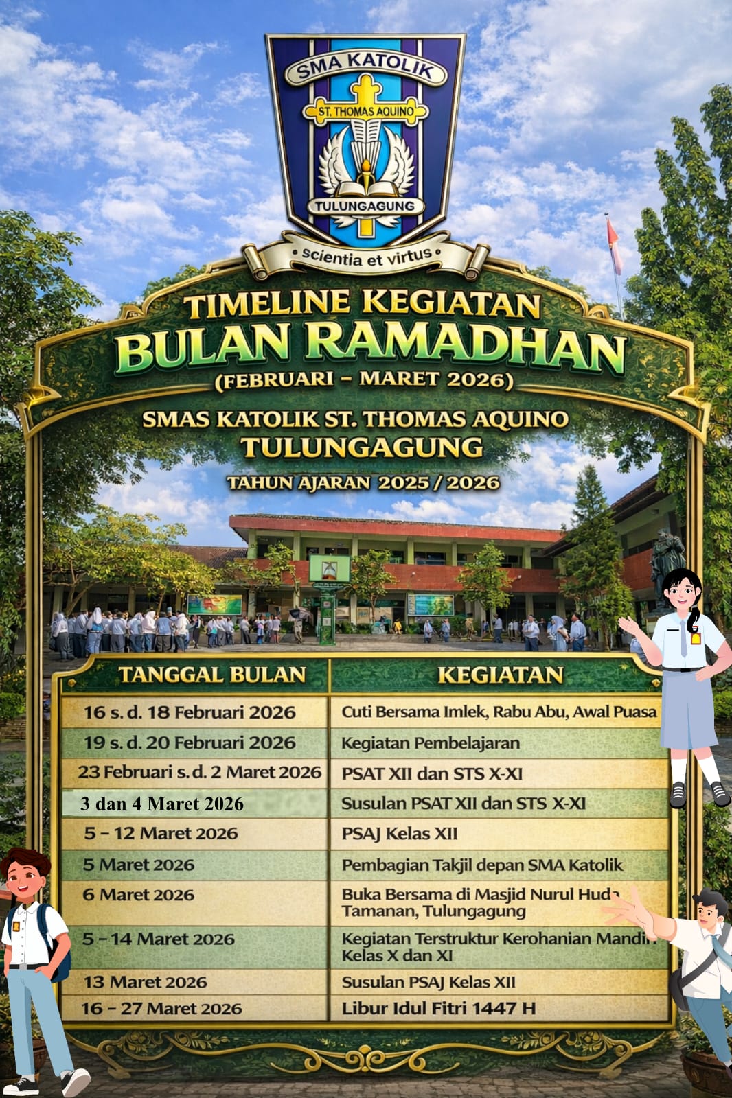 Pada bulan Februari dan Maret, SMA Katolik Santo Thomas Aquino memiliki beberapa jadwal kegiatan di bulan ramadhan ini. Berikut kami lampirkan jadwal kegiatan sekolah yang bisa dilihat di lampiran yang sudah disediakan