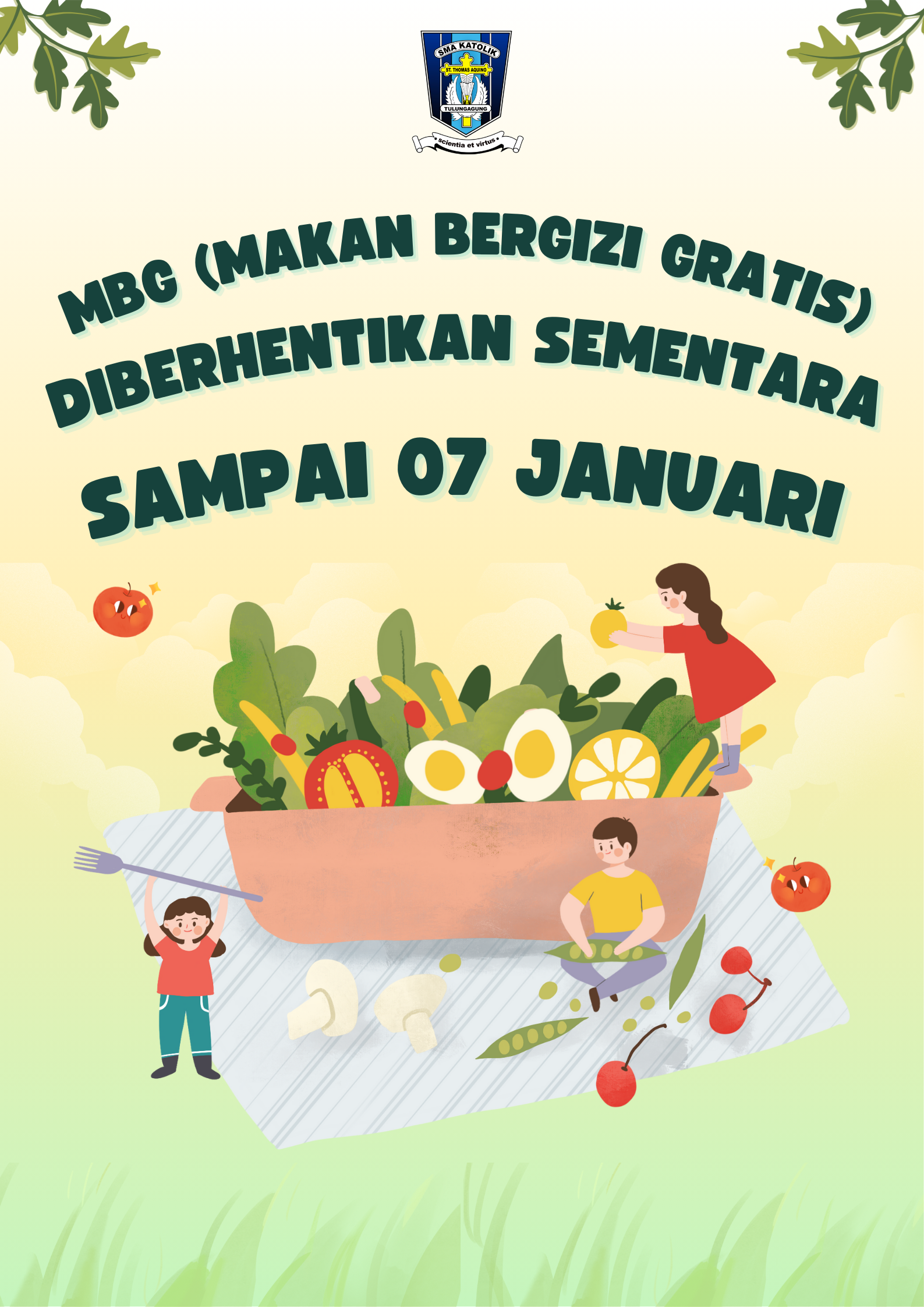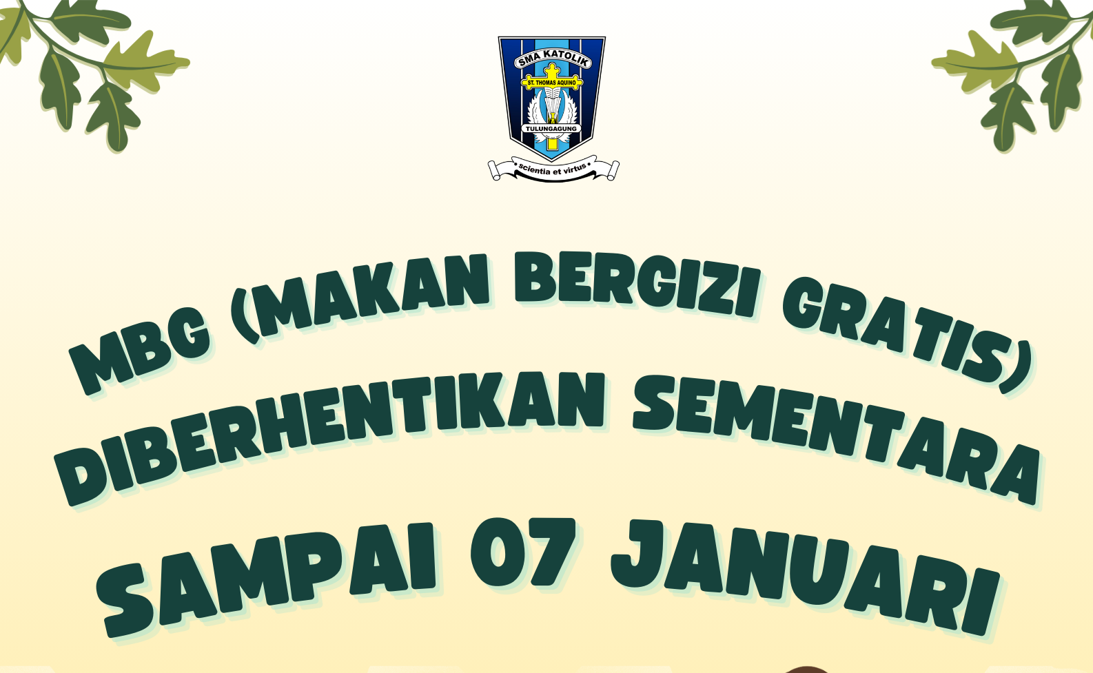 Berdasarkan informasi dari SPPG Kedungwaru, yang menjadi penanggung jawab MBG SMA Katolik Santo Thomas Aquino. Pembagian MBG masih akan diberhentikan sampai tanggal 07 Januari 2025. Mulai akan dibagikan kembali pada 08 Januari 2025. Demikian informasi yang dapat kami sampaikan.